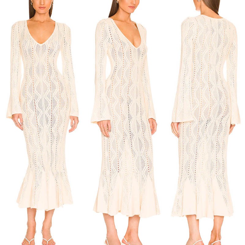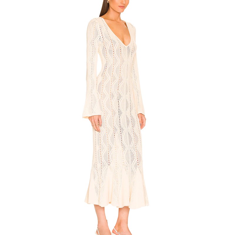 Lady V Neck Long Sleeve Slim Sexy Simple Fashion Hollow Out Design Beach Crochet Midi Dress