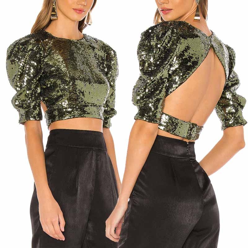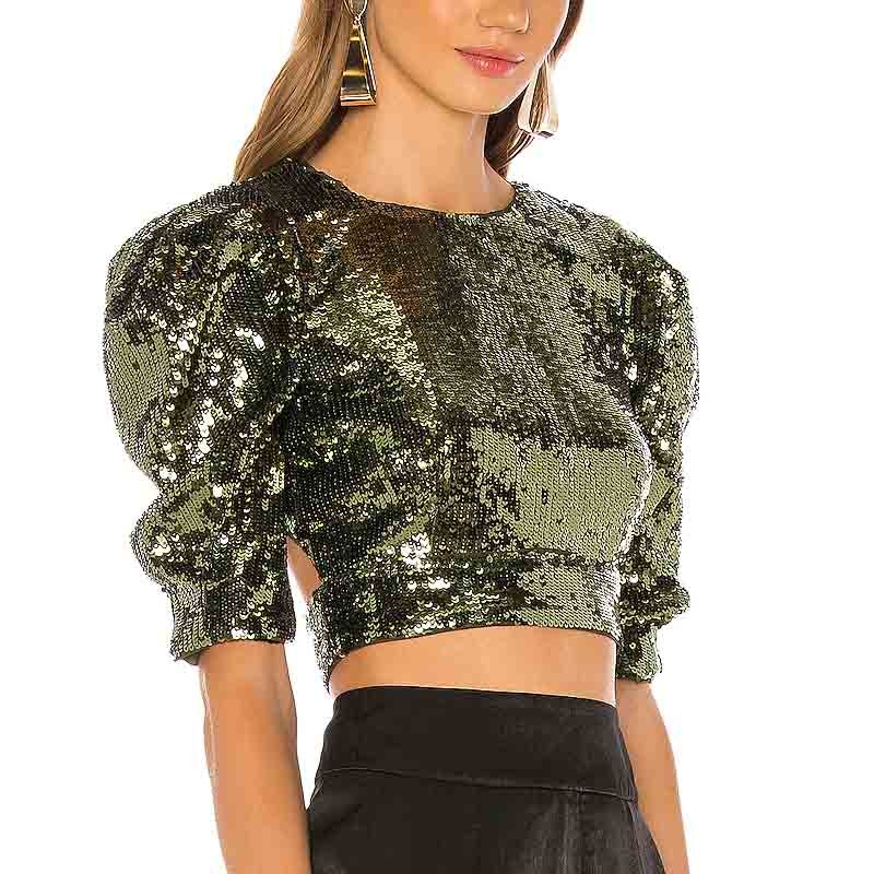 Summer Fashion Sequin Puff Sleeve Party Crop Top