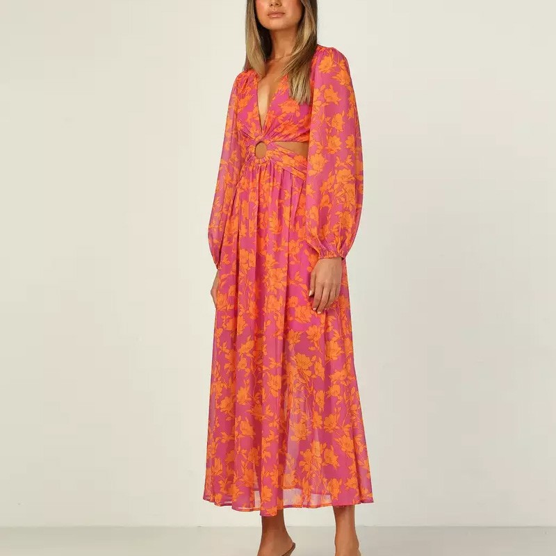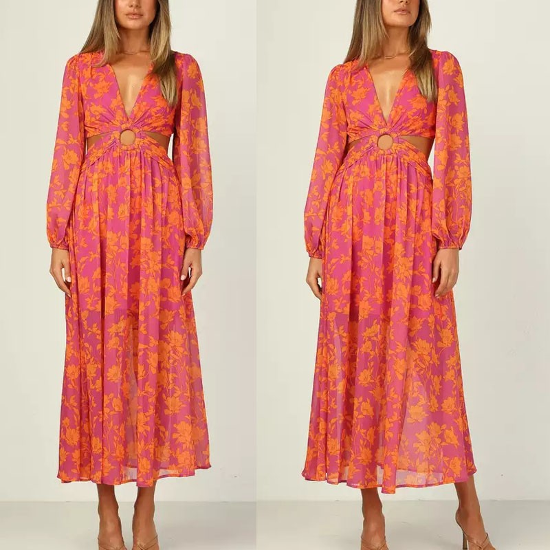 Women Floral Print Deep V Neck Long Sleeve Sexy Cut Out Maxi Dresses