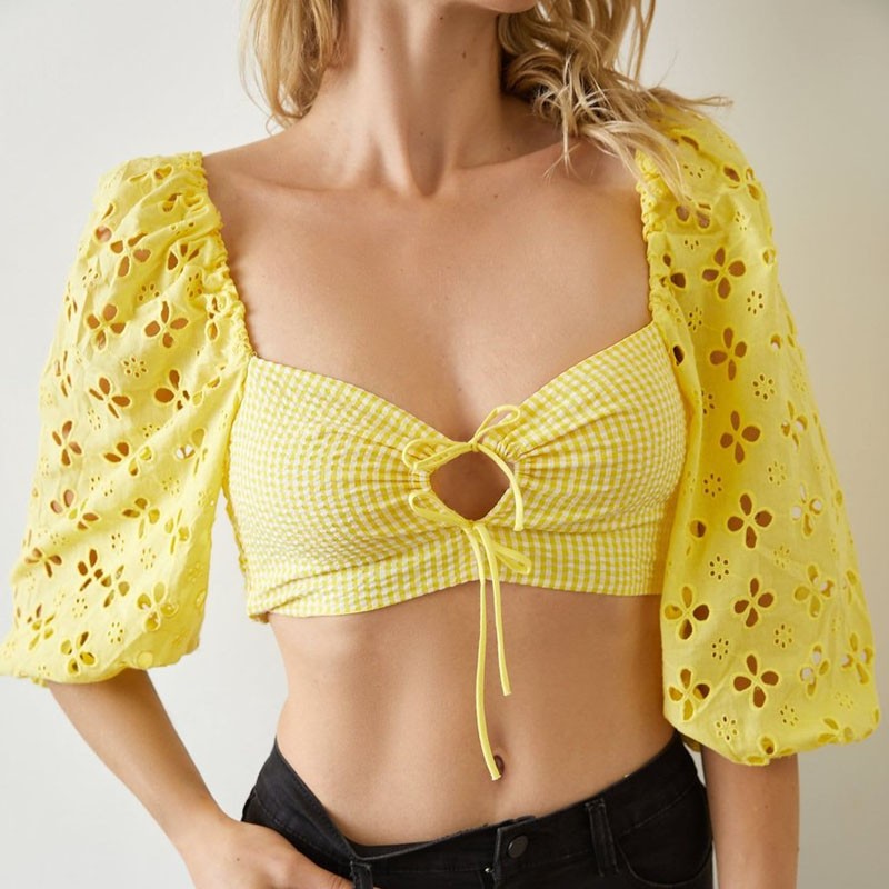 Keywords: Yellow Blouse Decoration: Hollow Out Place Of Origin: GuangDong, China Feature: Breathable, Dry Cleaning, Washable